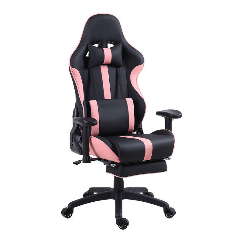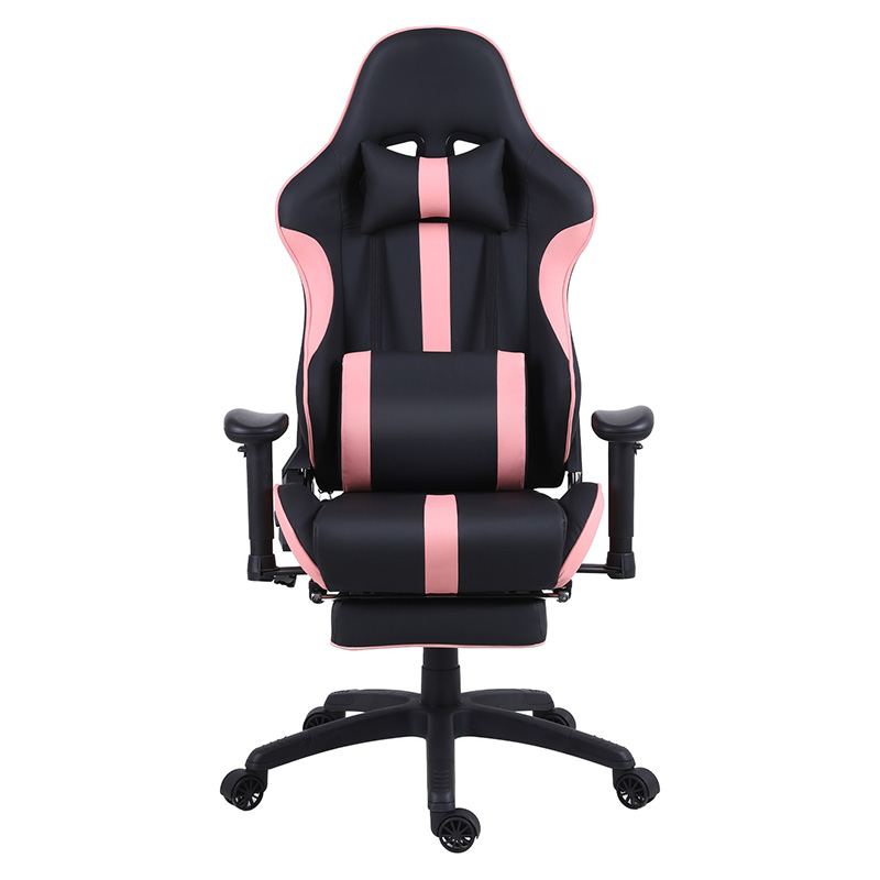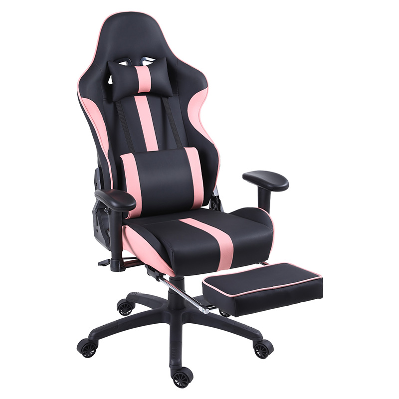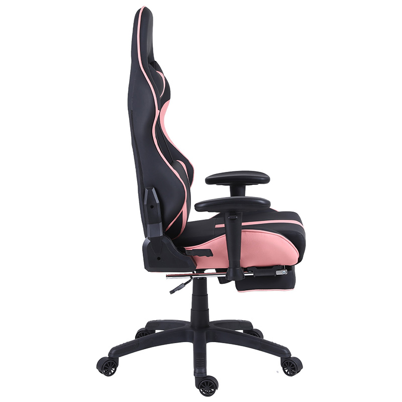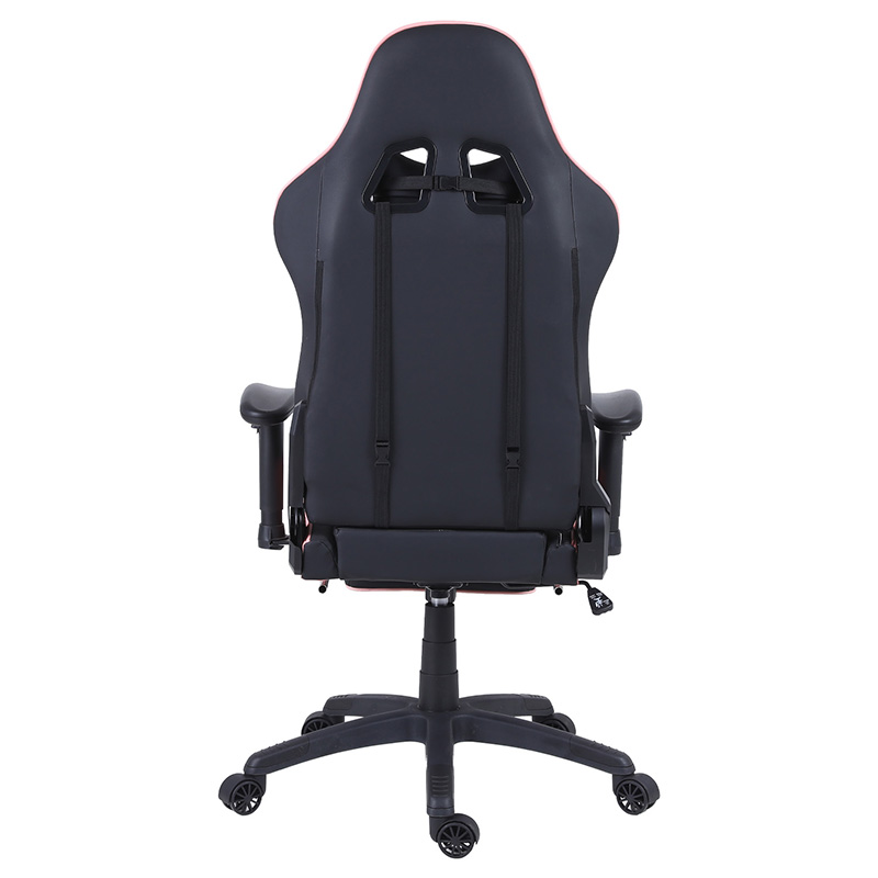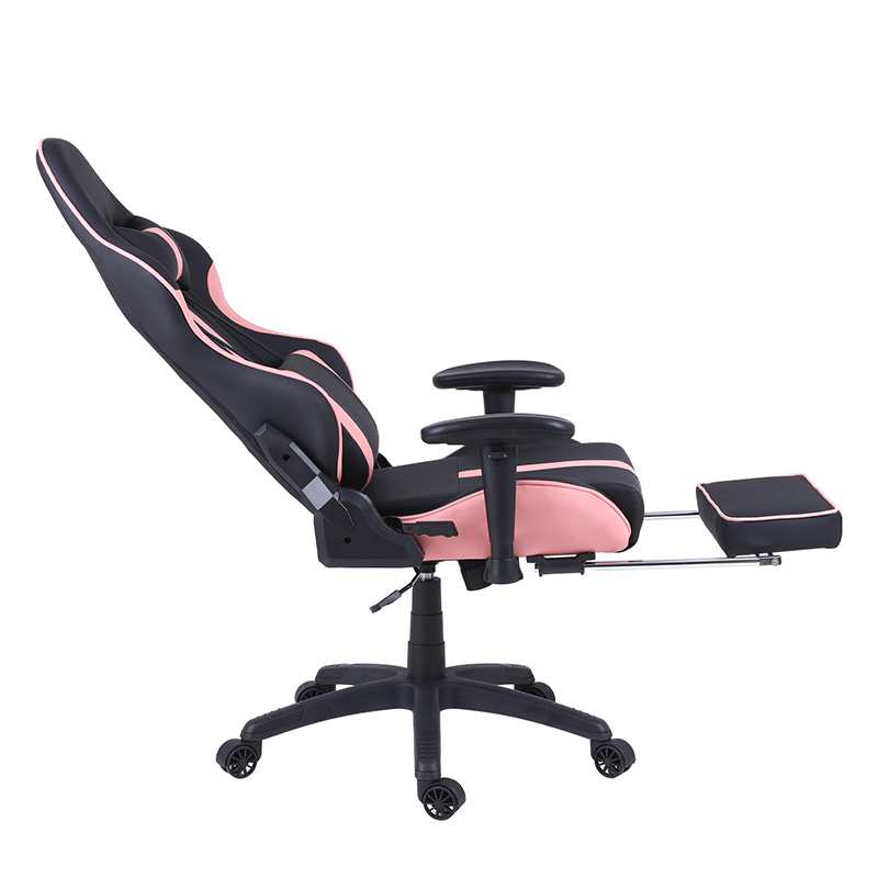 此款电竞椅采用1.2壁厚的全钢框架,内填充高弹定型绵,外包裹高耐磨PU皮,支持多角度工学后仰调节功能,颈部和腰部两处支撑贴合脊柱,配合可伸缩搁脚凳,是一款舒适的办公午休椅。